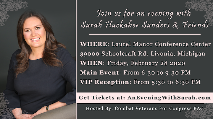 We encourage you to forward this notice to your relatives, associates, and friends in Michigan, to ask them to support the election of the endorsed Combat Veterans For Congress, and to join with us at the next Gala Event on February 28, 2020 in Livonia, Michigan, for “An Evening with Sarah Huckabee Sanders and Friends”.