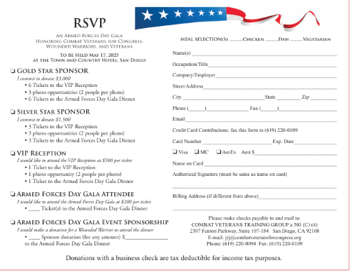 If you as an individual, or your business would like to be listed as a Sponsor of the Armed Forces Day Gala Event, please return the attachment with your payment to attend the VIP Reception, with a personal check as an individual or a business check to be a business sponsor. The check should be received by us by April 15, 2025, clearly listing either your name as a sponsor, or the name of your business as the business sponsor. The receipt of your donation by April 15, 2025, will provide us with enough time to include you or your business to be listed on a printed list of Sponsors that will be displayed at the entrance to the Pacific Ballroom on the night of the Gala Event.